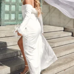 Robe Longue Champagne Fendue à Manches Longues Et Col Bardot