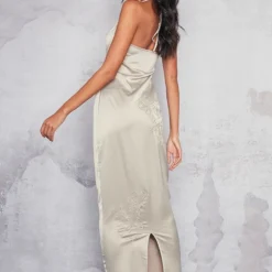 Robe Longue Satinée Vert Olive Brodée Fleurie à Col Bénitier