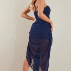 Robe Mi-longue En Mousseline De Soie Plissée Bleu Marine Transparente à Corset