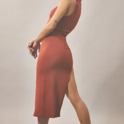 Robe Mi-longue Sans Manches Structurée Côtelée Rouille à Col Montant Détail Contours