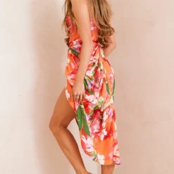 Robe Mi-longue Mandarine Satinée Décolletée à Bretelles Et Empiècement