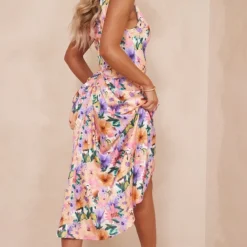 Robe Mi-longue Satinée Fleurie Multicolore à épaules Dénudées Et Jupe Drapée