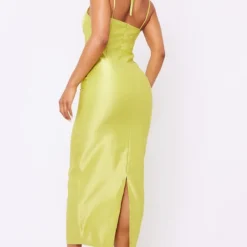 Robe Mi-longue Satinée Vert Citron Imprimé Renaissance à Corset Et Anneau