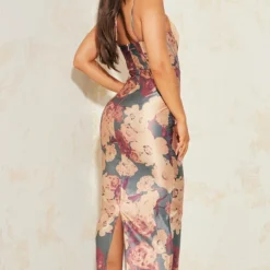 Robe Mi-longue Satinée Marron Imprimé Fleurs Abstraites à Corset Et Dentelle