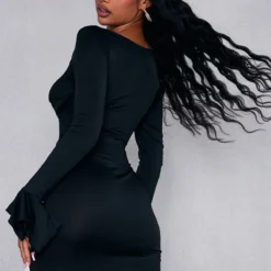 Robe Moulante Découpée Noire à Manches évasées Et Bonnets à Bordure De Dentelle