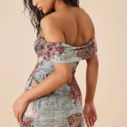Robe Moulante à Imprimé Rennaissance Multicolore Et Col Bardot