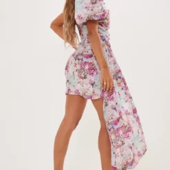 Robe Moulante Asymétrique Rose Fleurie Abstraite Drapée à Manche Bouffante