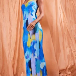 Logic Robe Longue Bleue Imprimé Abstrait Plissée à Bretelles Et Dos échancré