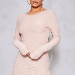 Robe Moulante Sable Clair Texturée à Col Rond Et Manches Longues