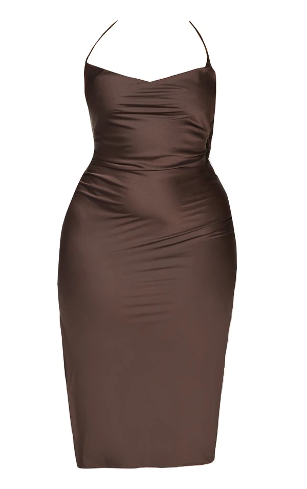 Plus Robe mi-longue à fines bretelles satinée chocolat à col bénitier et dos lacé