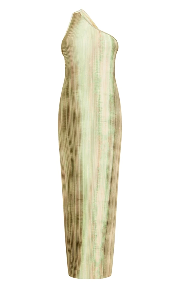 Robe asymétrique longue plissée verte imprimé aquarelle à dos échancré