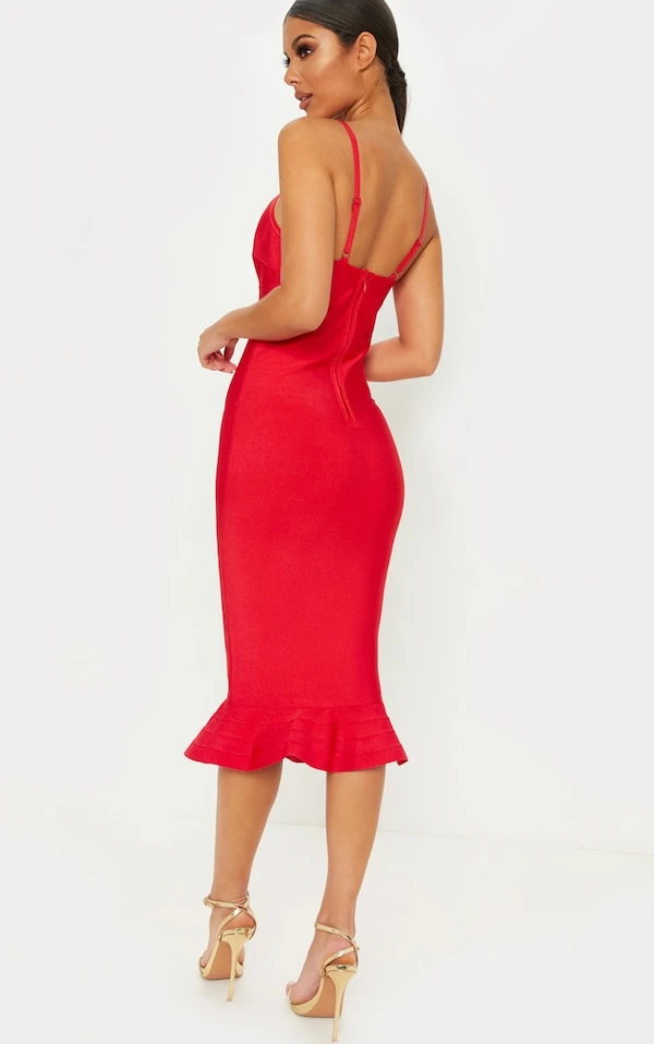 Robe bandage mi-longue rouge à fines bretelles et ourlet volanté