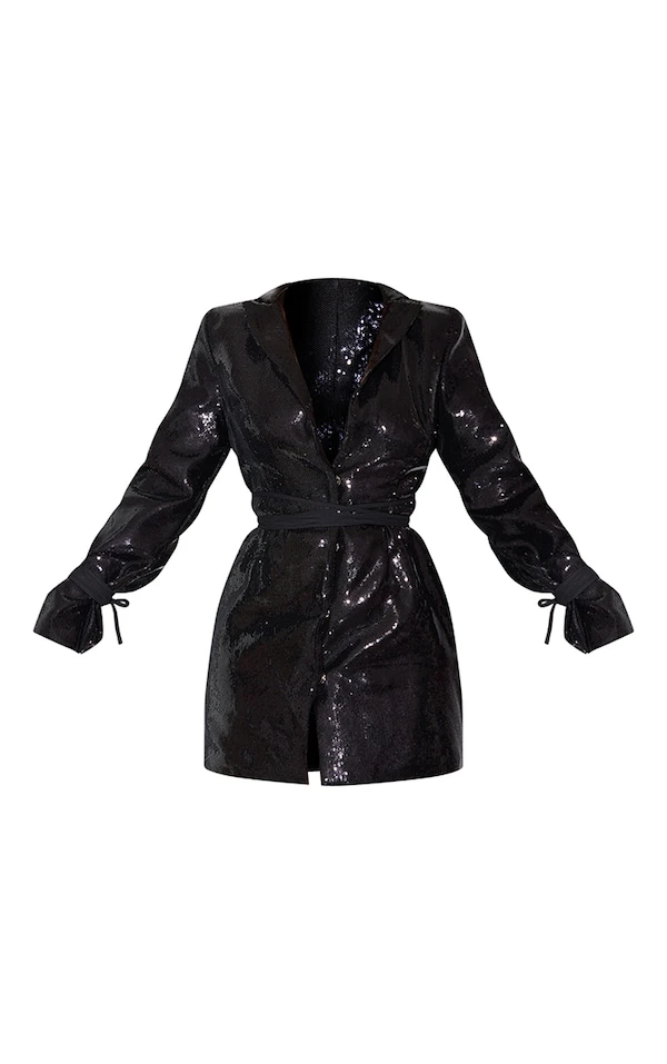So glam cette robe au style blazer. Dans son design à sequins de couleur noire et son détail manchettes, c’est le crush assuré. On enfile des talons et le look est complété !