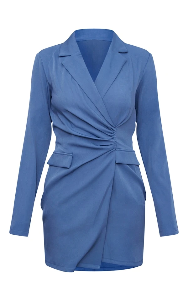 Robe blazer bleu acier en maille tissée à poches et taille froncée