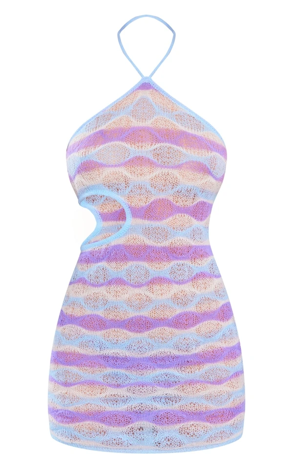Robe bleu ciel en maille tricot ajourée à vagues et découpes