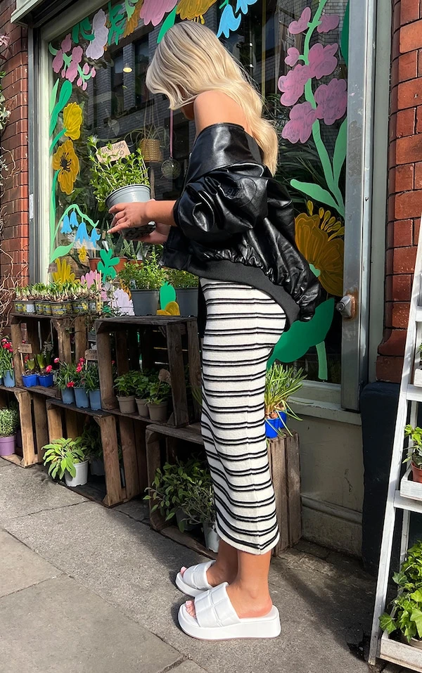 Divine, dans cette robe bustier à la coupe longue classy ! C’est impossible de passer à côté de son coloris noir & blanc, de sa matière en maille tricot douce et de son design à rayures. Portez-la avec une paire de talons et quelques accessoires pour un look qui va faire son petit effet. On adore !