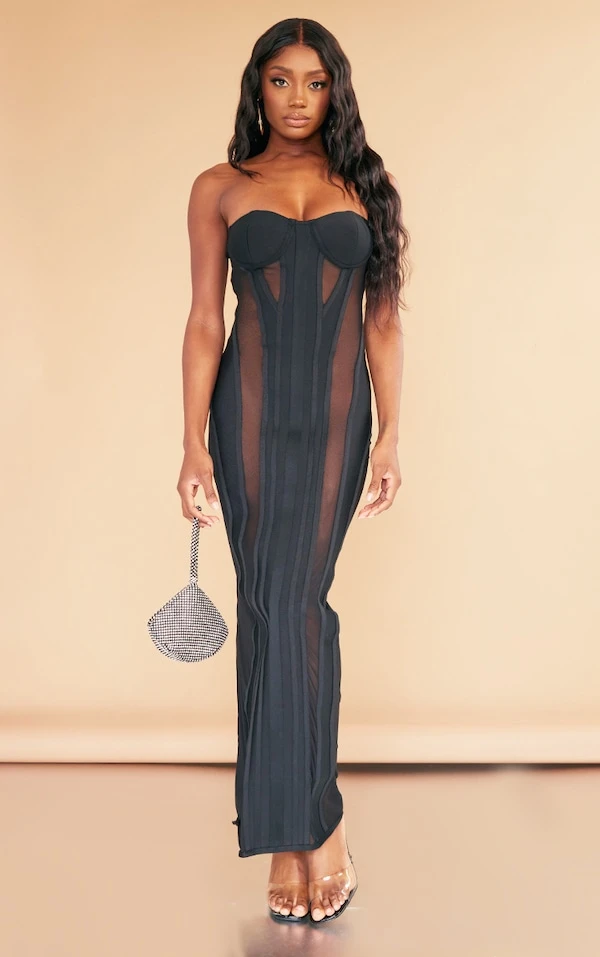 Robe bustier longue noire à détail bonnets et parties en mesh