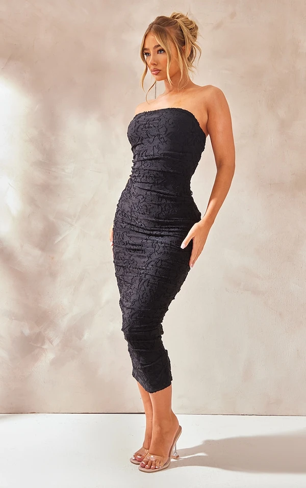 Robe Bustier Longue Texturée Fleurie Noire Froncée Sur Le Côté