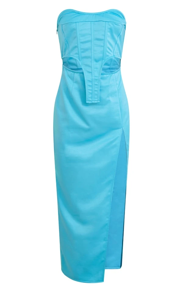 Robe bustier mi-longue satinée bleue fendue à corset et ourlet style étrier