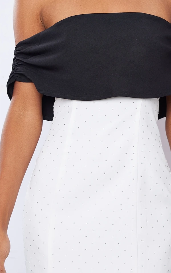 Robe bustier moulante blanche à col bardot et jupe strassée