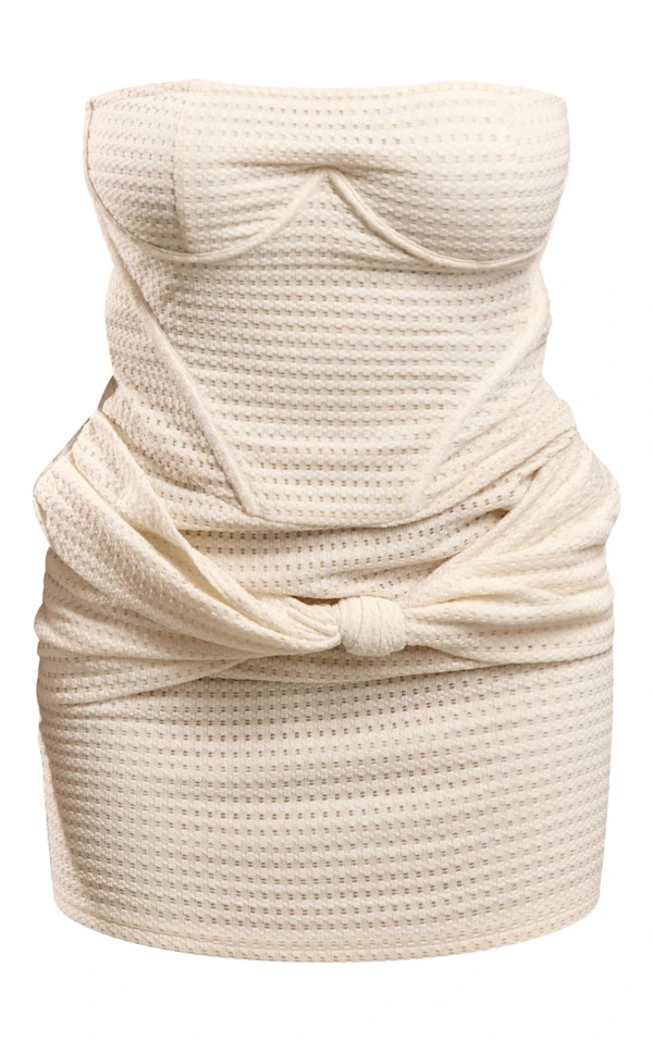 Robe bustier moulante texturée crème drapée à noeud et armatures