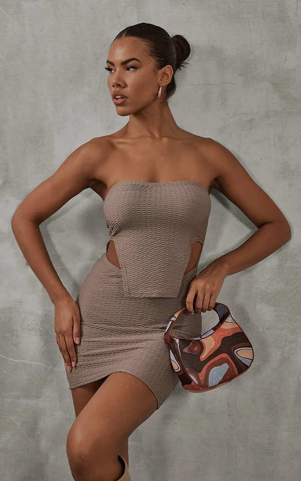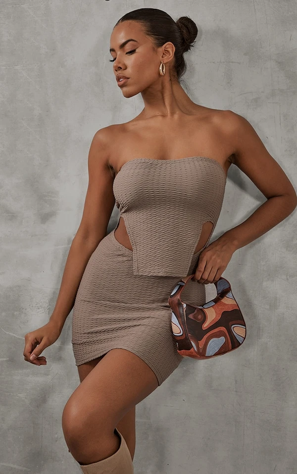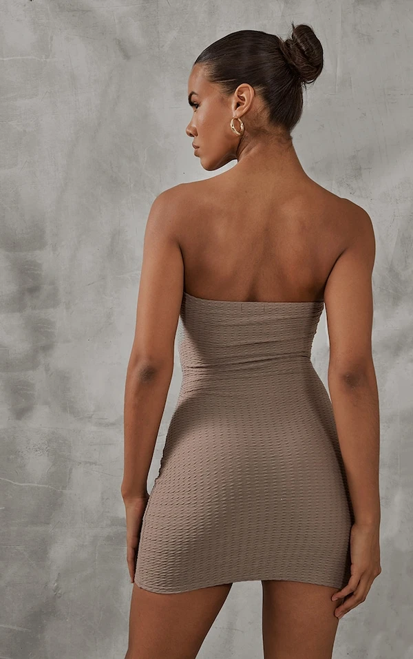 Trop belle dans cette robe bustier. Avec sa couleur café au lait, sa matière texturée et son design à ourlet tombant, on l’adore. En soirée, elle se porte avec une paire de sandales lacées et quelques accessoires, tout simplement !