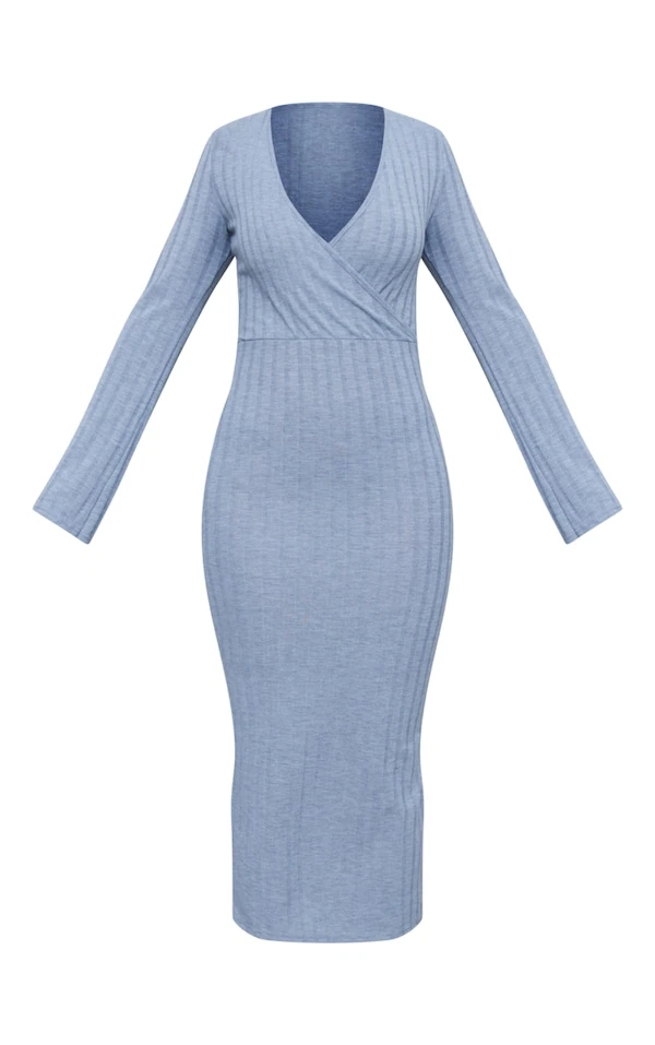 Robe cache-coeur mi-longue côtelée grise à manches évasées