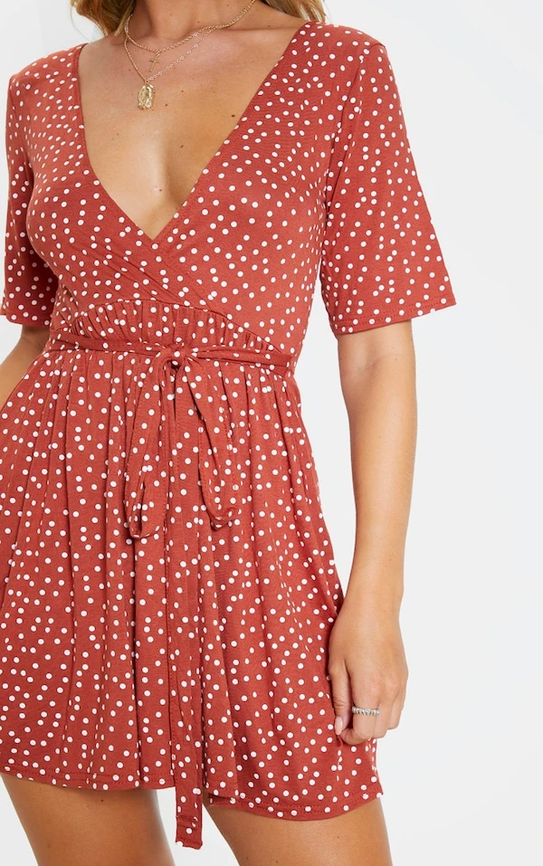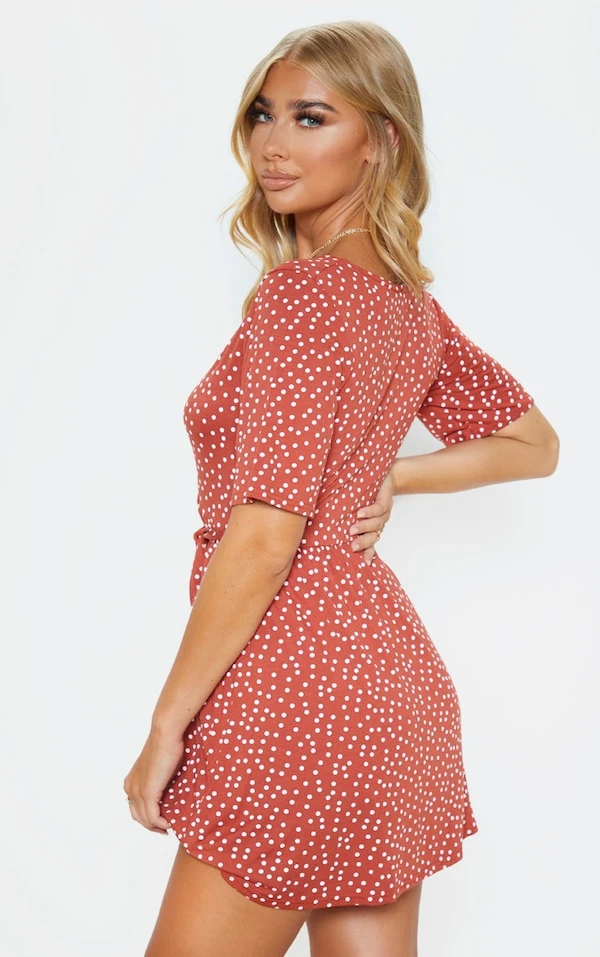 Robe cache-coeur terracotta imprimé pois à volants