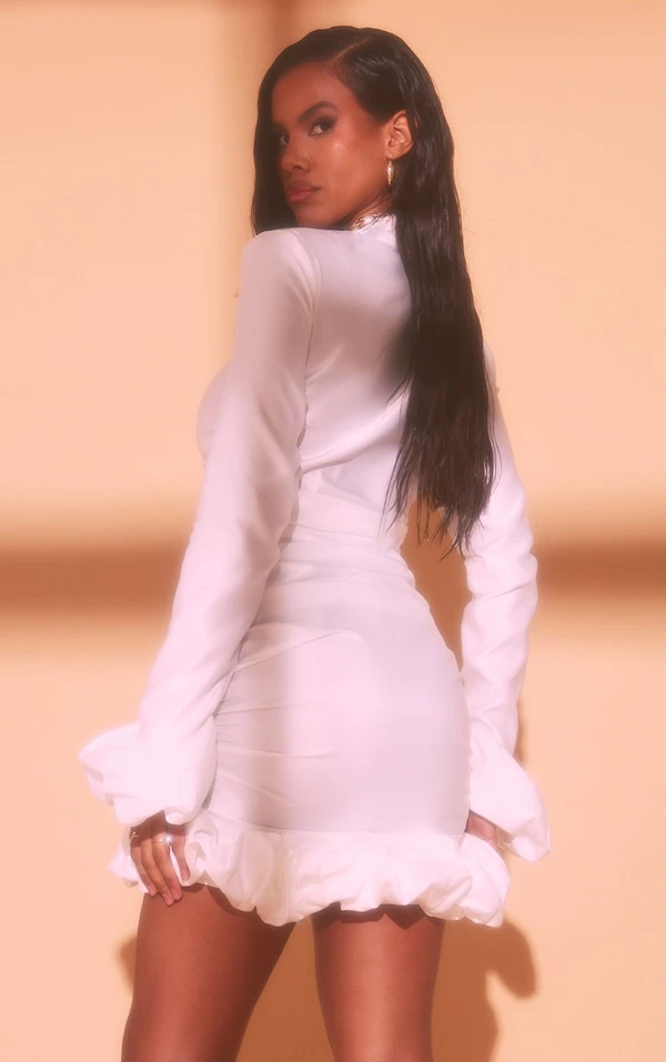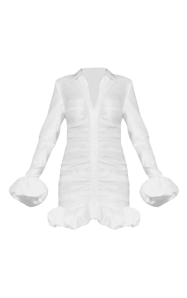 Robe chemise blanche satinée à devant froncé et ourlet volanté