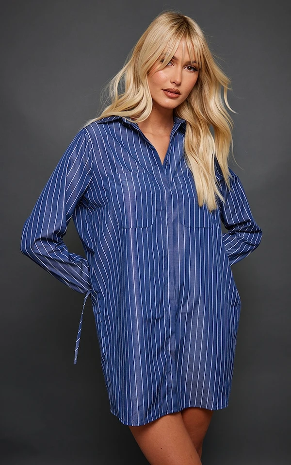 En aour avec la couleur bleu marine de cette robe chemise. Avec sa matière à rayures et ses manches évasées et nouées, elle a tout pour plaire. Portez-la avec une paire de baskets et un manteau long pour un look chill super stylé. Pour rejoindre les copines en ville, ce look est parfait !