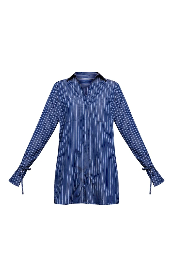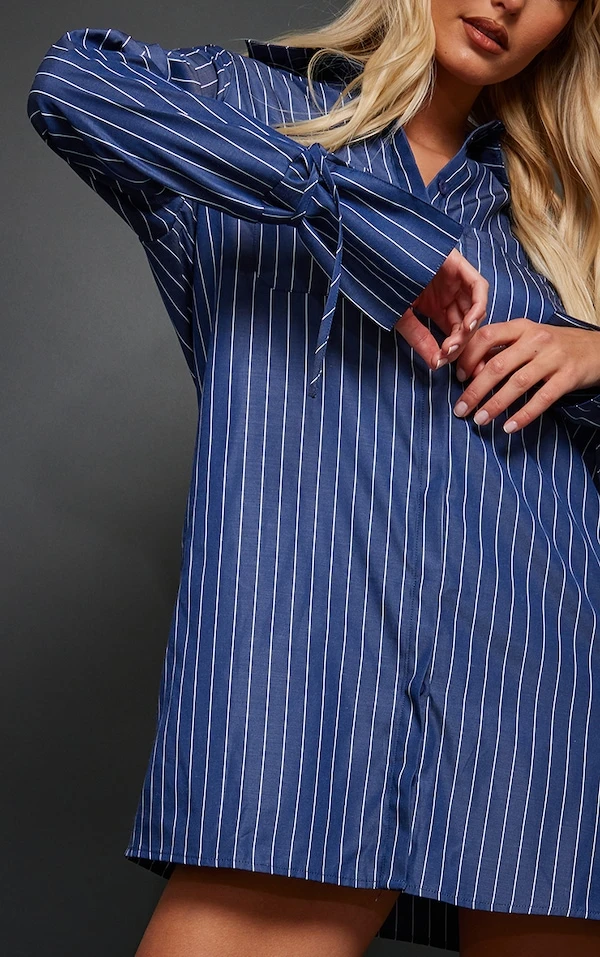 Robe chemise bleu marine à rayures et manches évasées nouées