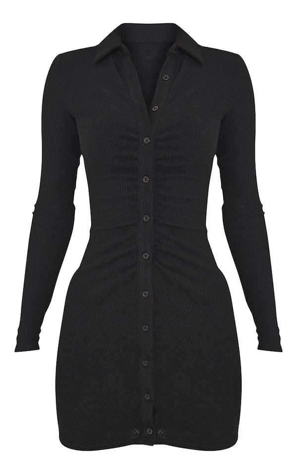 Robe chemise côtelée brossée noire à manches longues et fronces