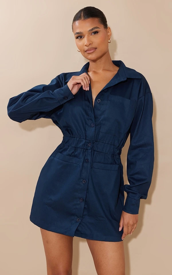 Cette robe chemise est juste iconic ! Avec sa couleur bleu marine, sa maille sergée et ses poches frontales, on l’adore. Elle se porte avec des escarpins pour attirer tous les regards au bureau. Boss babe à l’approche !
