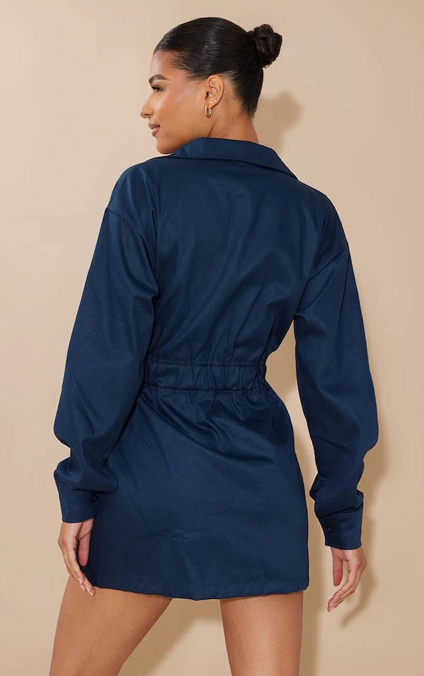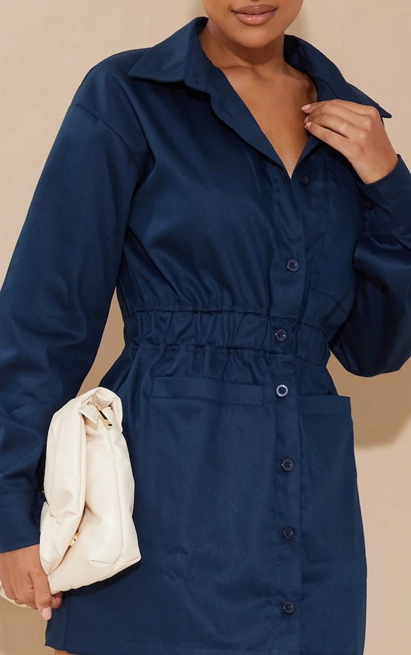 Robe chemise en maille sergée bleu marine à poches frontales et taille élastique