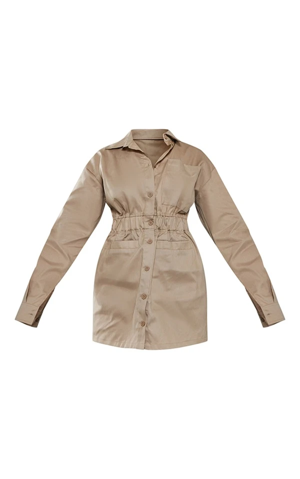 Robe chemise en maille sergée sable à poches frontales et taille élastique