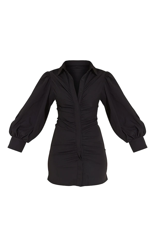 Robe chemise en maille tissée froncée noire à manches bouffantes