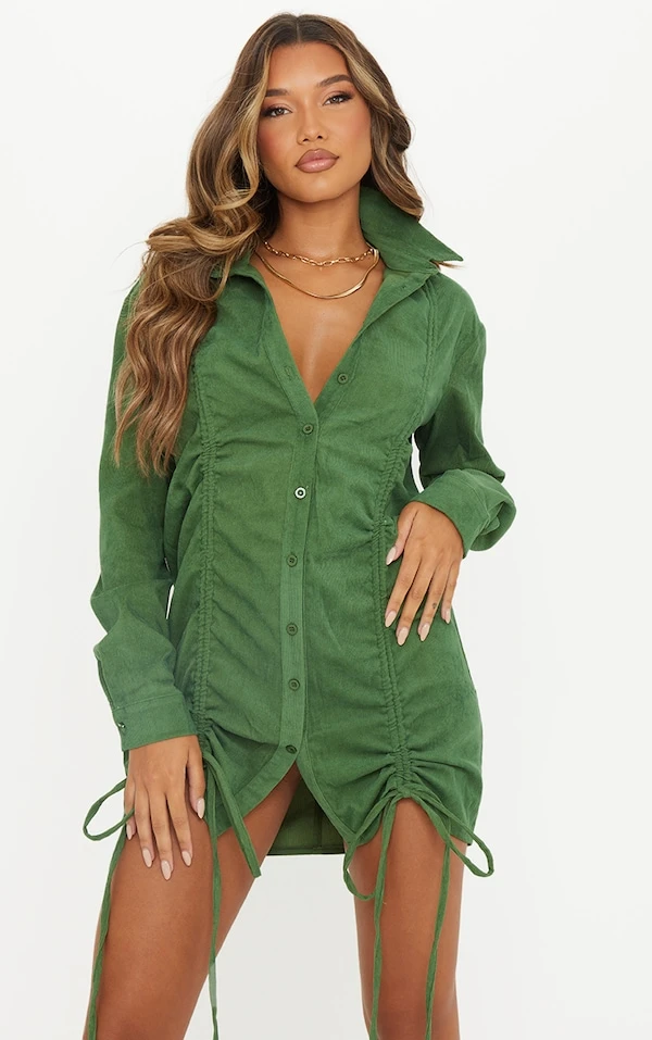 Tellement belle la robe chemise, on crush de suite. Entre son velours côtelé très cool, son coloris kaki et son design doublement froncé, c’est à porter avec une paire de mules et quelques accessoires. Pas besoin de plus.