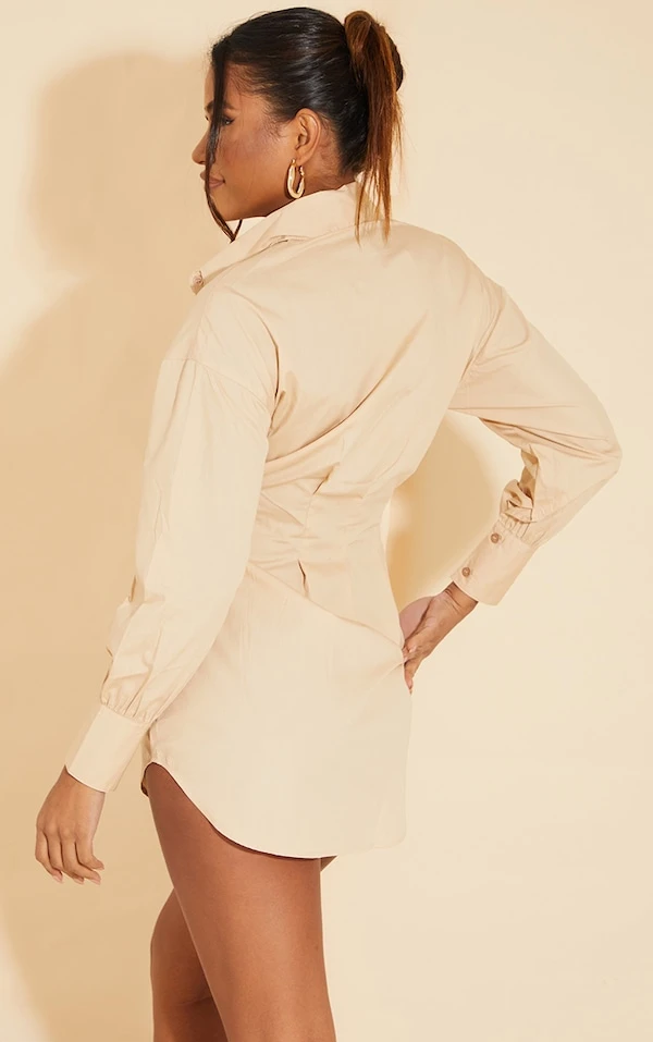 Robe chemise gris pierre ajustée à la taille à manches longues