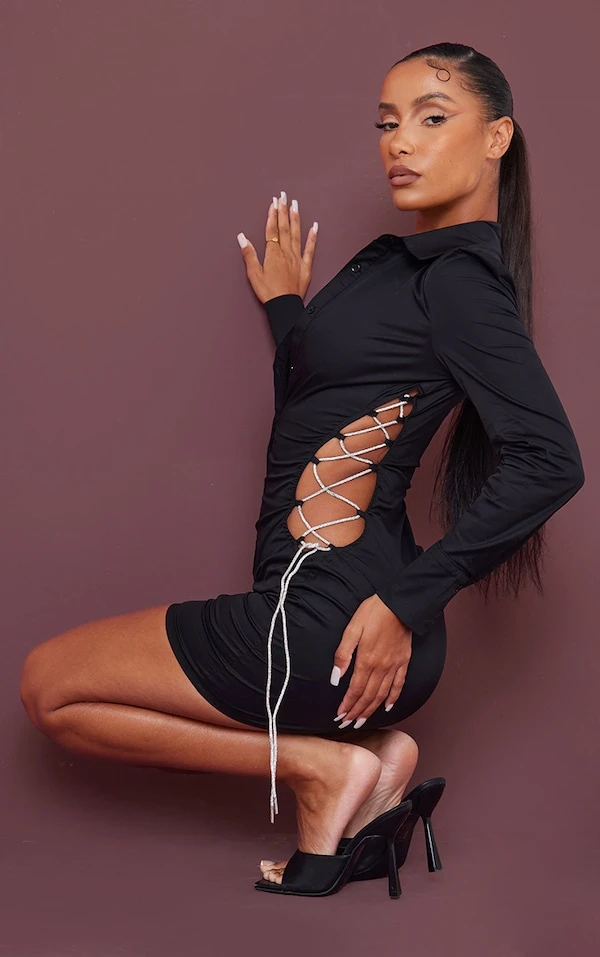 Irrésistible cette robe chemise ! Elle est parfaite avec sa matière noire à la coupe mini, ses côtés découpés et son look à strass. Il ne manque plus que des talons et un petit sac à main pour un look sophistiqué et casual.