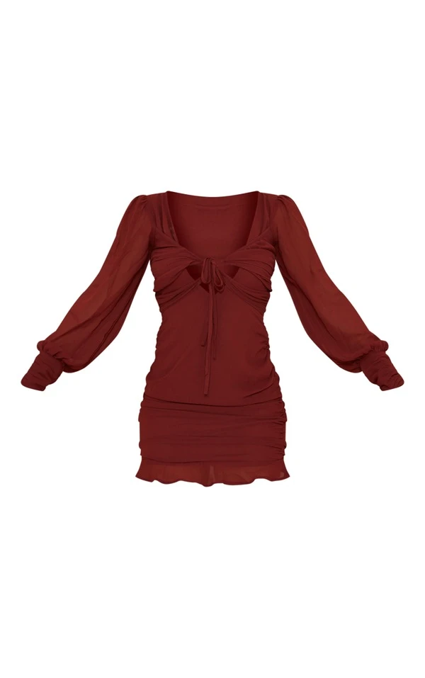 Robe chemise plissée chocolat à manches longues et liens multiples