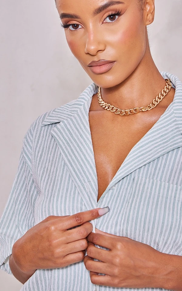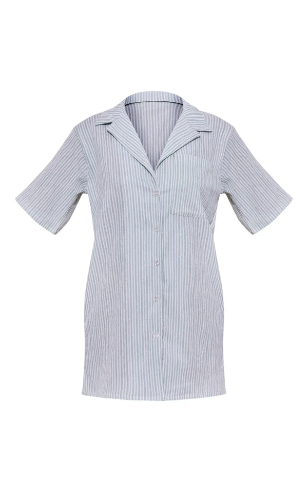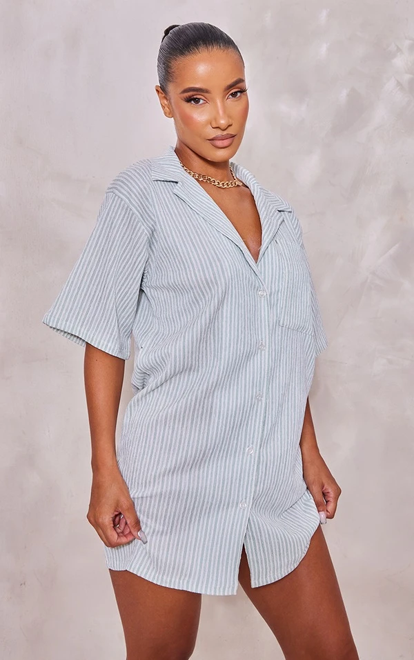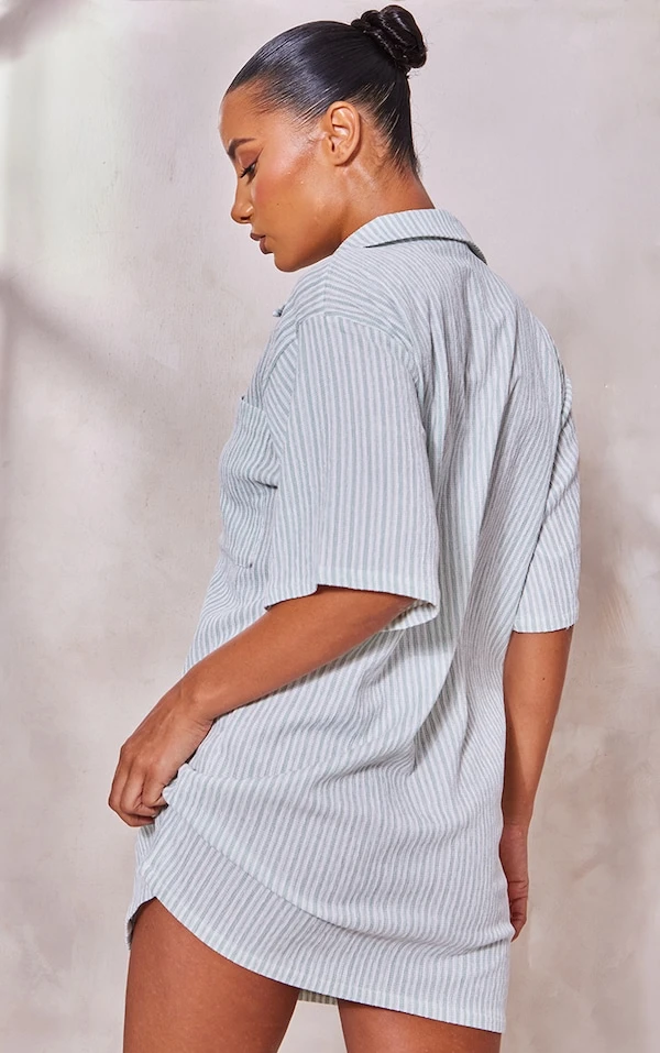 Robe chemise texturée rayée vert sauge à manches courtes et poche