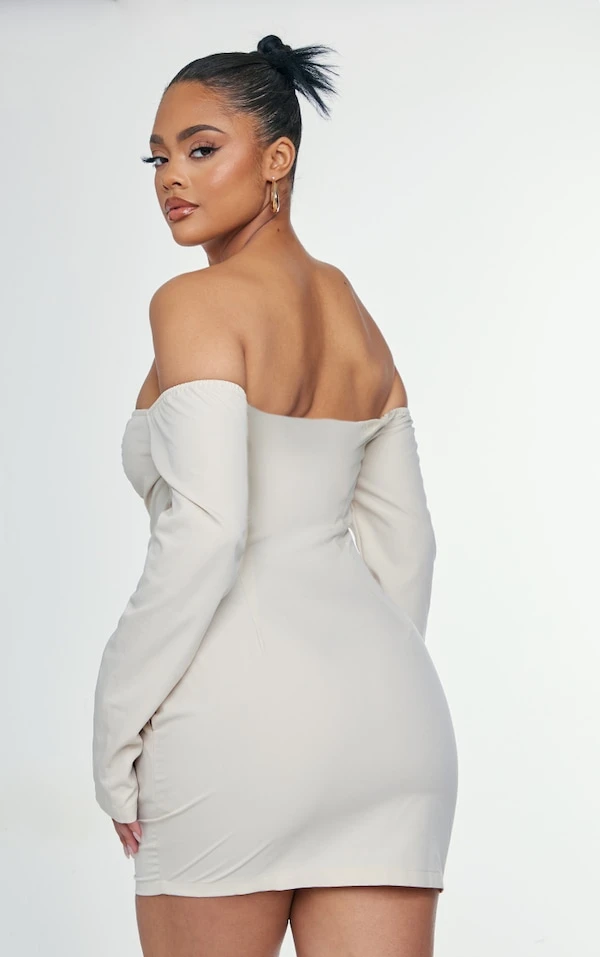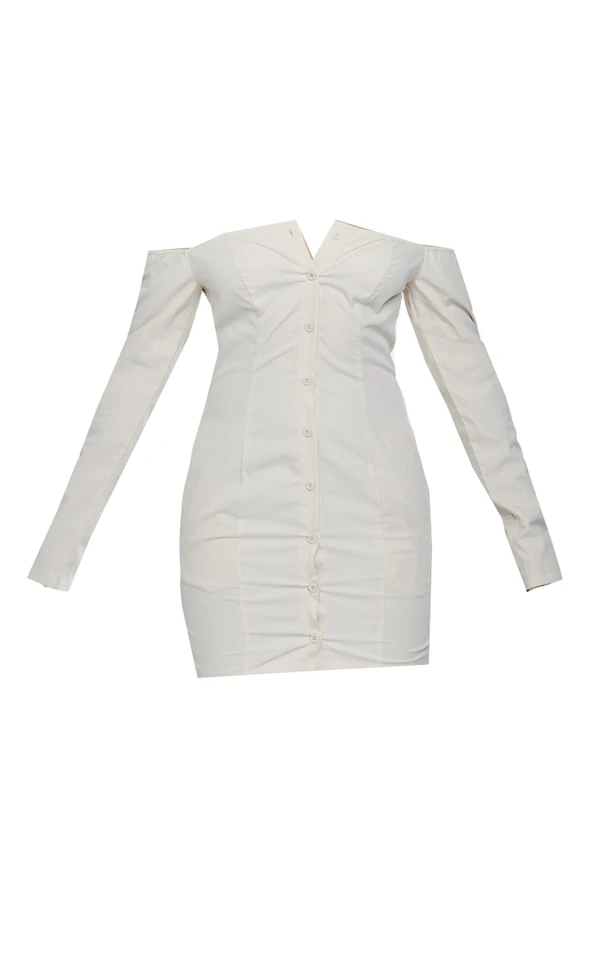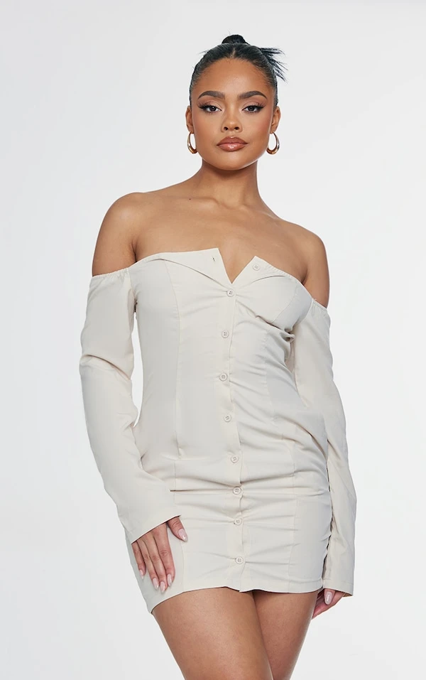 Robe chemise tissée crème à col bardot et détail poches