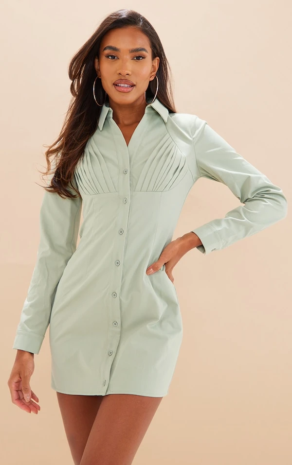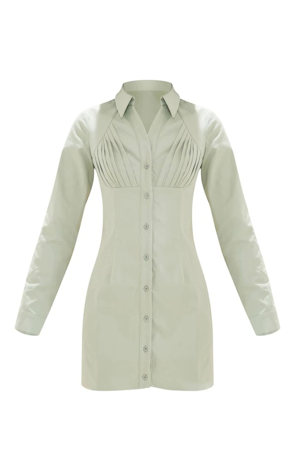 Robe chemise vert sauge à buste plissé