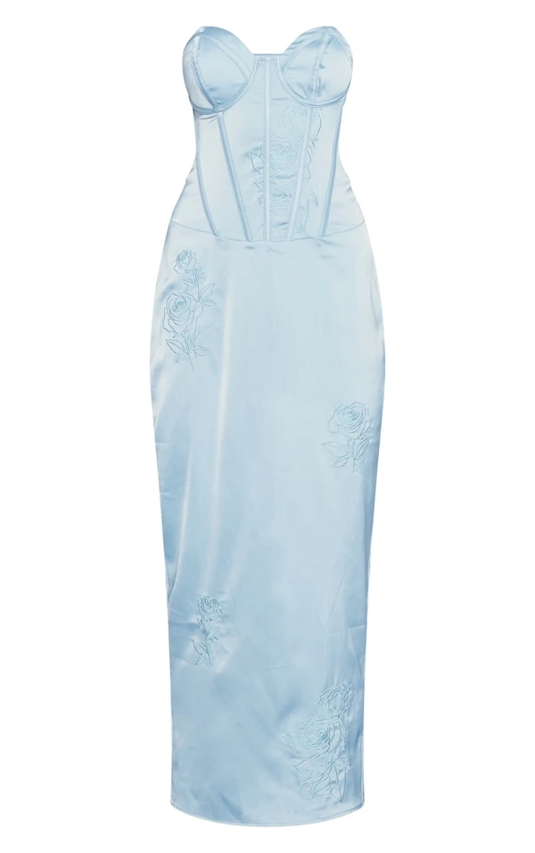 Robe corset mi-longue bleu-gris satinée à fleurs brodées