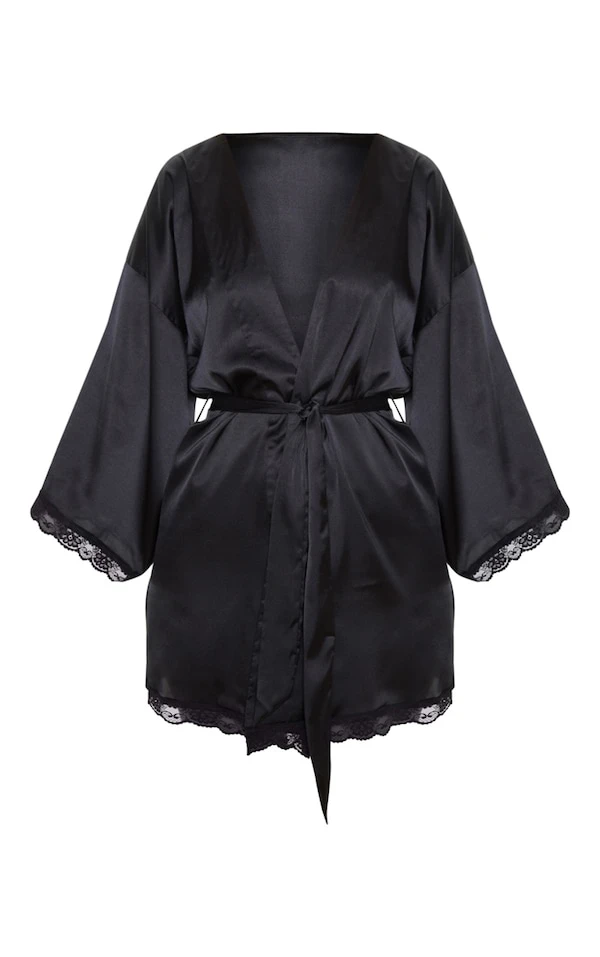 Une vraie vision boujee cette robe de chambre satinée! Entre son noir profond et son détail dentelle, elle s’enfile au saut du lit pour chiller avec sensualité. Nous on valide.