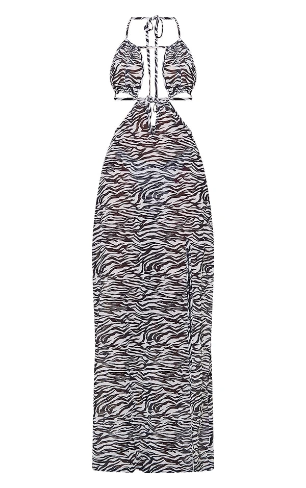 Robe de plage longue effet lin noir et blanc imprimé zèbre à dos nu et découpes