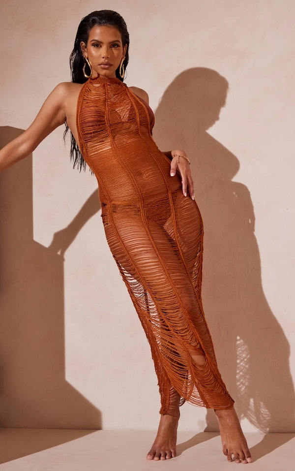 Hot et parfaite pour l’été, cette robe transparente ! Avec son effet frangé, sa couleur marron clair et sa coupe longue, elle est parfaite pour aller à la plage. Il ne manque que des compensées et un max d’assurance !