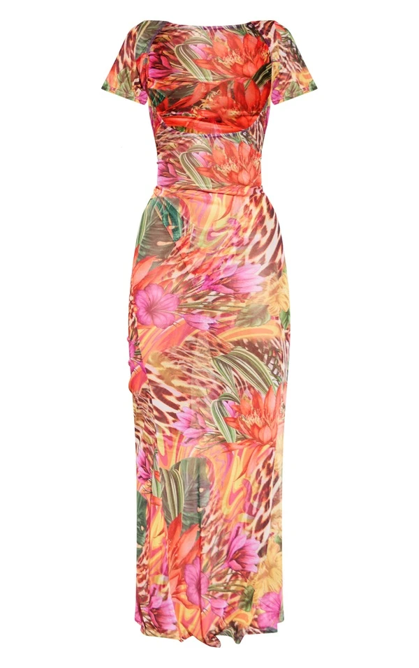 Robe de plage longue en mesh orange imprimée animal mélangé à manches courtes et col arrondi