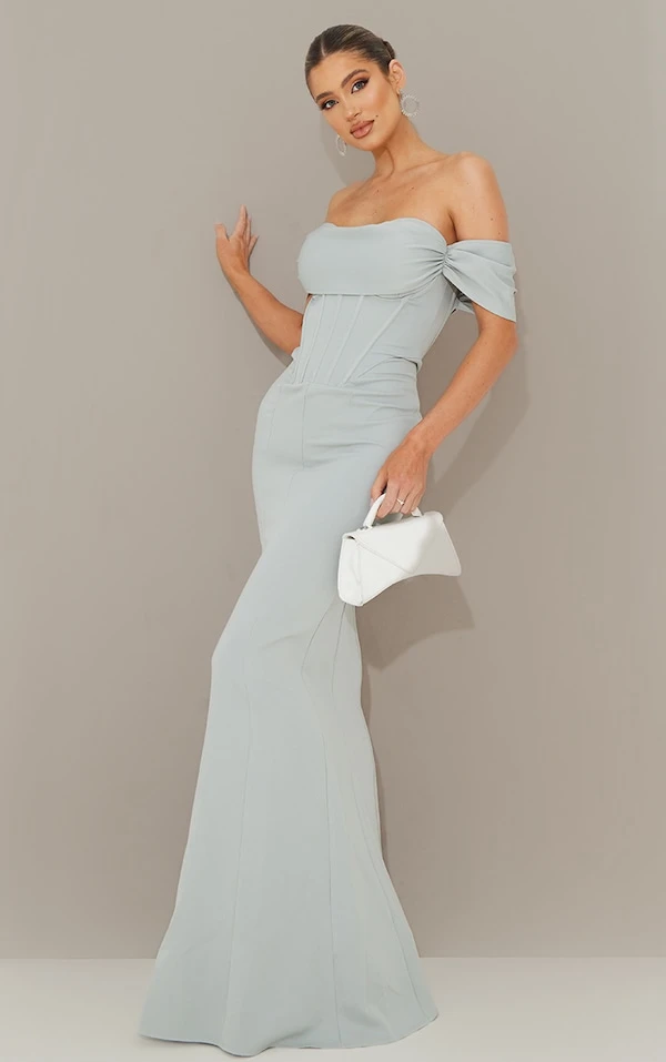 Robe de soirée style corset vert sauge à col bardot