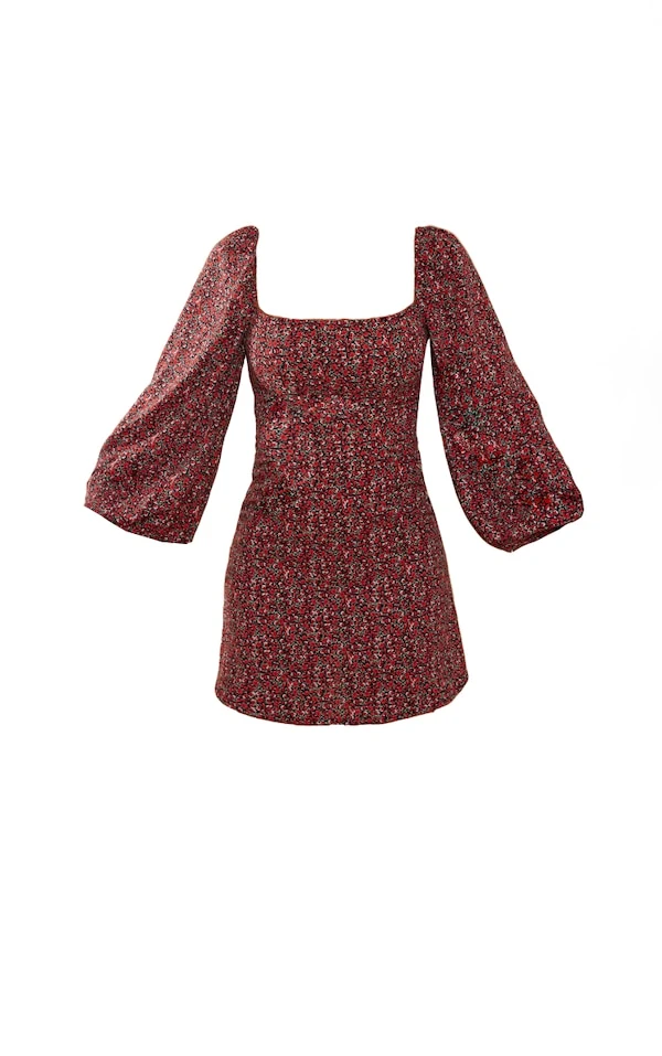 Robe droite col carré et manches bouffantes rouge à petites fleurs